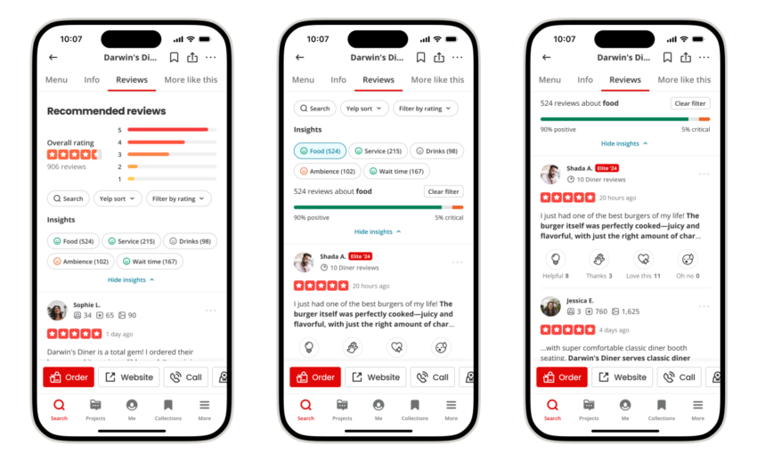 Yelp zaten listenin en üstünde işletmeler için yapay zeka destekli özetler gösteriyor. Şimdi şirket, bir işletmenin farklı yönlerini vurgulamak için yorumlar açısından bir kullanım verisi hazinesinden yararlanıyor.